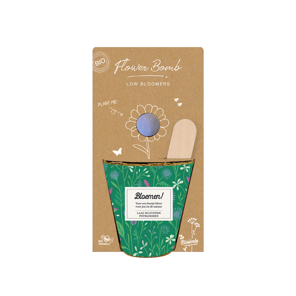 Blossombs zijn bommetjes vol wilde bloemzaadjes. Ze zijn gemaakt van natuurlijke materialen, waaronder klei en vezels. De bloemen die uit de bommetjes groeien zijn speciaal uitgezocht voor de bijen en vlinders. Zij kunnen onze hulp namelijk goed gebruiken! Blossombs hebben weinig verzorging nodig, maar zorg er wel voor (als moeder natuur dit niet doet) dat ze genoeg water krijgen. Het beste kan je ze aan het begin van het voorjaar ‘zaaien’, zodat je er 2 seizoenen lang van kan genieten.