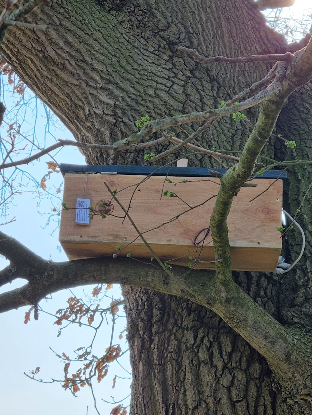 CaptureWILD Nistkasten mit integrierter Digitalkamera Dieser in den Niederlanden handgefertigte Nistkasten der Steinkauz ist bereits mit einer Kamera ausgestattet, sodass Sie nichts selbst zusammenbauen müssen. Der Anschluss des Nistkastens an Ihren Router/Modem ist Plug-and-Play und wird durch ein einfaches Handbuch unterstützt. Neben der Live-Anzeige der Bilder können Sie auch die Bilder überprüfen, die die Kamera automatisch für Sie im internen Speicher speichert. Digitale IP-Netzwerkkamera. Bewegungserkennung, Bilder werden nur gespeichert, wenn eine Bewegung erkannt wird. 1080P Full-HD-Auflösung. Zeigen Sie Bilder live und zurück auf Ihrem Telefon an, überall auf der Welt. Infrarot-Nachtsicht unsichtbares Licht für Mensch und Tier, das Bild wechselt nachts auf Schwarz-Weiß. Sie müssen kein IT-Spezialist sein, um diese Kamera anzuschließen, das Handbuch führt Sie Schritt für Schritt durch den einfachen Prozess. Die Kamera ist direkt mit Ihrem Router/Modem verbunden, sodass Sie die Bilder überall einsehen können, sofern Ihr Telefon zu diesem Zeitpunkt über eine funktionierende Internetverbindung verfügt. Dies kann WLAN oder 4G/5G sein. Für die Installation benötigen Sie lediglich Ihren Router/Modem und eine freie Steckdose in der Nähe Ihres Routers/Modems. Eine Steckdose am Nistkasten muss nicht vorgesehen werden, Strom und Bild laufen über dasselbe dünne Kabel. Wählen Sie bei der Bestellung die gewünschte Kabellänge; Dieses Kabel kommt zwischen dem Nistkasten und Ihrem Router/Modem. Wir bieten Kabel bis zu 100 Meter an. Wenn Sie eine größere Distanz überbrücken möchten oder Ihr Router/Modem mit diesem Kabel nicht vom Nistkasten aus erreichbar ist, empfehlen wir Ihnen, uns zu kontaktieren, wir bieten Ihnen dann eine maßgeschneiderte Lösung an. Wir haben für jedes Szenario eine maßgeschneiderte Lösung. CaptureWILD ist der erste Anbieter von Nistkästen, der Nistkästen mit einer digitalen IP-Kamera anstelle einer analogen Kamera auf den Markt bringt. Warum ist digital besser? Digital hat viele Vorteile gegenüber der traditionellen analogen Kamera: Einen Nistkasten mit einer veralteten analogen Kamera erkennt man an der Verkabelung, die einen weiß-rot-gelben Stecker hat. Eine höhere Bildauflösung schärferes Bild. Eingebauter Rekorder. Bilder können auf Ihrem Telefon angezeigt werden. Perfekte Nachtsicht, bei der die Kamera automatisch auf Schwarz-Weiß-Bild umschaltet, um einen höheren Kontrast zu bieten. Die Bilder sind mit Ihrem Netzwerk verknüpft, sodass Sie Ihre Bilder überall auf der Welt anzeigen können. Eine Digitalkamera verfügt über eine Bewegungserkennung und zeichnet nur auf, wenn Bewegung vorhanden ist. Bilder können auf Ihrem Telefon angezeigt werden.