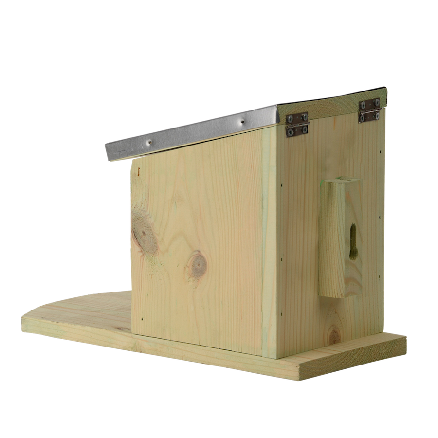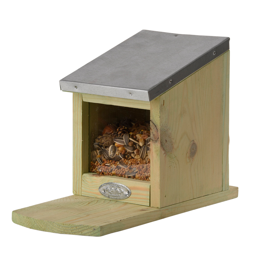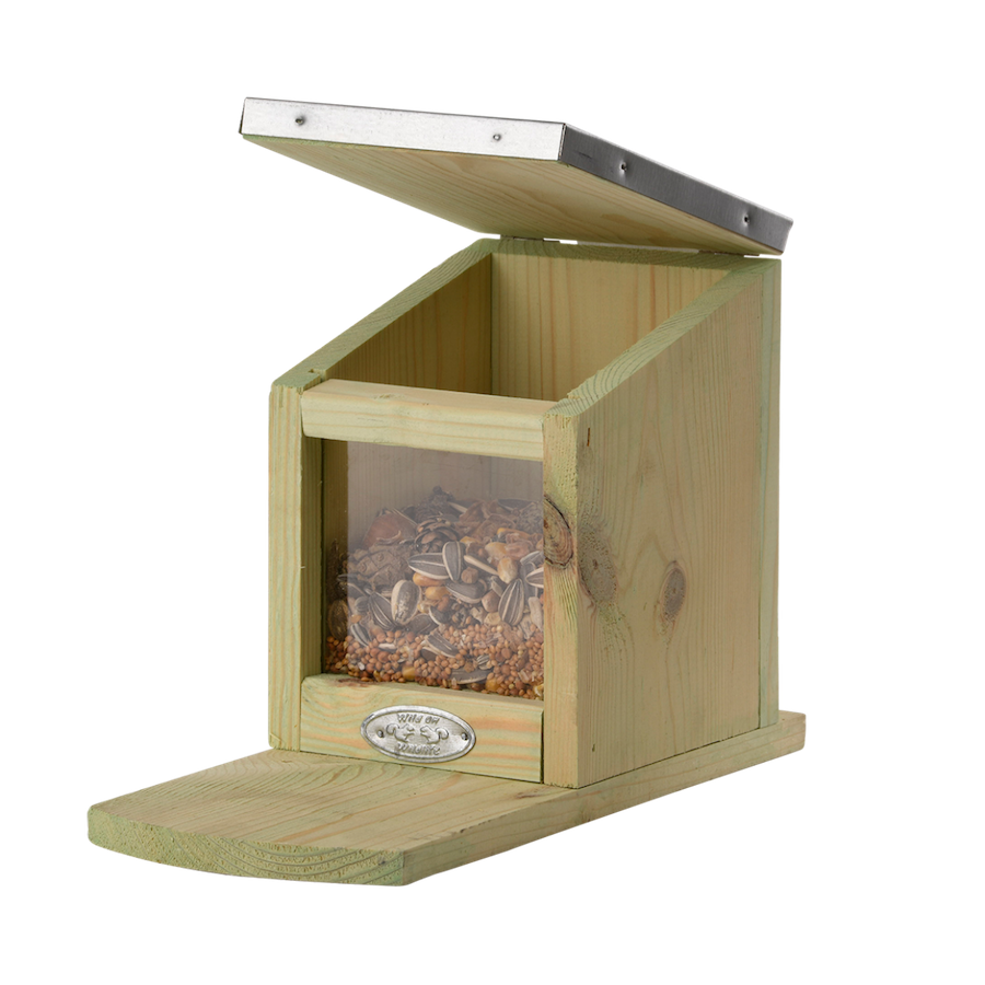 Eichhörnchen sind echte Akrobaten in Bäumen und Sträuchern. Sie sind geschickt darin, Nahrung in ihre Hände zu bekommen. Diese Nagetiere fressen bevorzugt Erdnüsse, Walnüsse, Haselnüsse und Sonnenblumenkerne. Trotz vieler Vogelliebhaber beschädigen und plündern Eichhörnchen oft Vogelhäuschen. Dieses speziell für Eichhörnchen konzipierte Futterhäuschen mit beweglicher Dachklappe kann sowohl mit Nüssen als auch mit Eichhörnchenfutter befüllt werden. In kurzer Zeit entdeckten sie, wie man das Dach des Futterhauses öffnet, um an dieses Futter zu gelangen. Sie essen es an Ort und Stelle oder verstecken es im Garten, um einen Vorrat für den Winter anzulegen. Außerdem sind diese glatten Tiere beim Fressen besser zu beobachten.