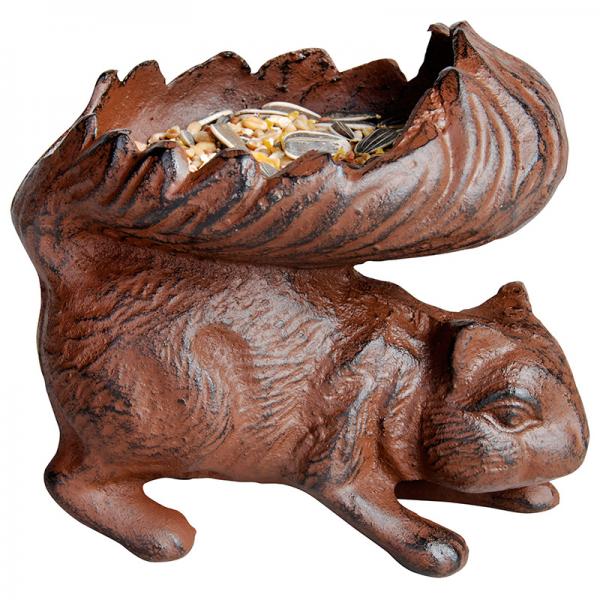 Eichhörnchen sind gern gesehene Gäste im Garten. Dieses Exemplar bietet Vögeln und Eichhörnchen einen schönen Futterplatz. Der Schwanz des Eichhörnchens ist so konzipiert, dass er ein Gefäß bildet. Diese Schüssel kann mit Futter oder Wasser gefüllt werden. Diese dekorative Tierfigur aus Gusseisen wird nach jahrhundertealter Handwerkskunst und Tradition einzeln von Hand gegossen.