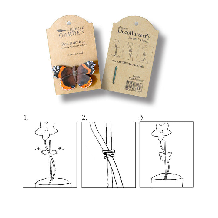 Die handgefertigten Schmetterlinge von Wildlife Garden können drinnen und draußen zur Dekoration verwendet werden. Dank des Magneten auf der Rückseite können die Schmetterlinge zum Beispiel als Kühlschrankmagnete verwendet werden. Die Schmetterlinge können mit dem mitgelieferten Draht auch zum Dekorieren von Blumen und/oder Pflanzen verwendet werden. Auf den ersten Blick könnte man beim Anblick der Chopped Aurelia meinen, es sich um einen echten Schmetterling zu handeln, der jeden Moment auf dem Weg zur nächsten Blüte davonfliegen könnte. Unsere Schmetterlinge erheitern Ihre Pflanzen, auch wenn sie nicht blühen. Die DekoSchmetterlinge sind ein schönes Geschenk für sich selbst oder für andere. Die Schmetterlinge sind handgefertigt aus Lindenholz und von Hand bemalt. Die verwendete Farbe ist selbstverständlich umweltfreundlich. Die Sammlung besteht derzeit aus den folgenden bekannten europäischen Schmetterlingen: Hakkelde Aurea, Peacock Eye, Lemon Butterfly, Mourning Cloak, Tree Blue, Atalanta und Queen's Page.