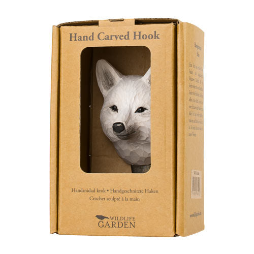 Holzgeschnitzter Polarfuchs mit bronzefarbenem Haken