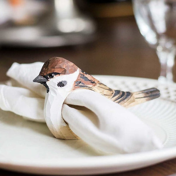 Lassen Sie die Natur Ihren Tisch mit einem handgeschnitzten Spatzen-Serviettenring inspirieren. Der Spatz ist kleiner und kompakter als der Haussperling und kommt in den meisten Teilen Europas, aber auch in Amerika, Australien und Asien vor. Der fachmännisch geschnittene Serviettenring ist in umweltfreundlichen Farben handbemalt, damit die ganze Familie lernen kann, diesen treuen Gartenbesucher zu erkennen. Um die bestmögliche Qualität unserer Produkte zu erhalten, werden unsere hölzernen Serviettenringe fachmännisch von Hand geschnitten und mit umweltfreundlicher Farbe von Hand bemalt.