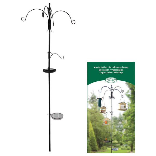 Die ultimative All-in-One-Futter-, Tränk- und Badestation für Gartenvögel. Diese praktische und dekorative Station ist einfach zu montieren und eignet sich ideal für jeden Garten. An den unterschiedlichen Haken können verschiedene Futterartikel aufgehängt werden. Zusätzlich können die mitgelieferten Schalen mit Wasser oder Samen befüllt werden. Set bestehend aus 4-teiliger Stange, Doppelhaken, Einzelhaken, Wassernapf und Futternapf einfach zusammenzubauen k/d verpackt in vollfarbiger Geschenkbox