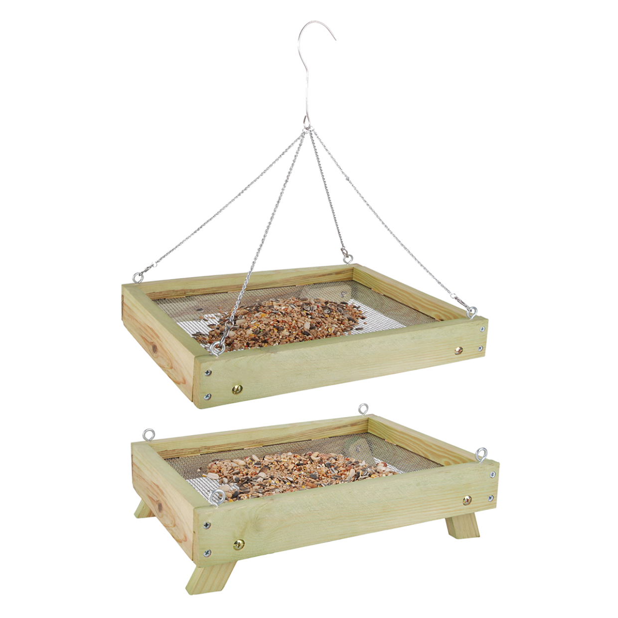 Dieser Futtertisch kann auf zwei Arten verwendet werden. Durch Ausklappen der Beine lässt sich der Futtertisch auf den Rasen stellen und einfach verschieben. Der Futtertisch kann auch aufgehängt werden. Auf den Boden gestellt, lockt der Futtertisch andere Vögel wie Haussperling, Rotkehlchen, Amsel, Zaunkönig und Star an. Wird der Futtertisch aufgehängt, kann er Vögel wie Kohlmeise, Blaumeise und Schwanzmeise anlocken. Der Netzboden sorgt für optimalen Wasserablauf. kann sowohl auf dem Boden als auch hängend verwendet werden leicht zu bewegen leicht zu reinigen mit unserem Fresstischschaber FB529 L 27,8 x B 35,4 x H 11,2