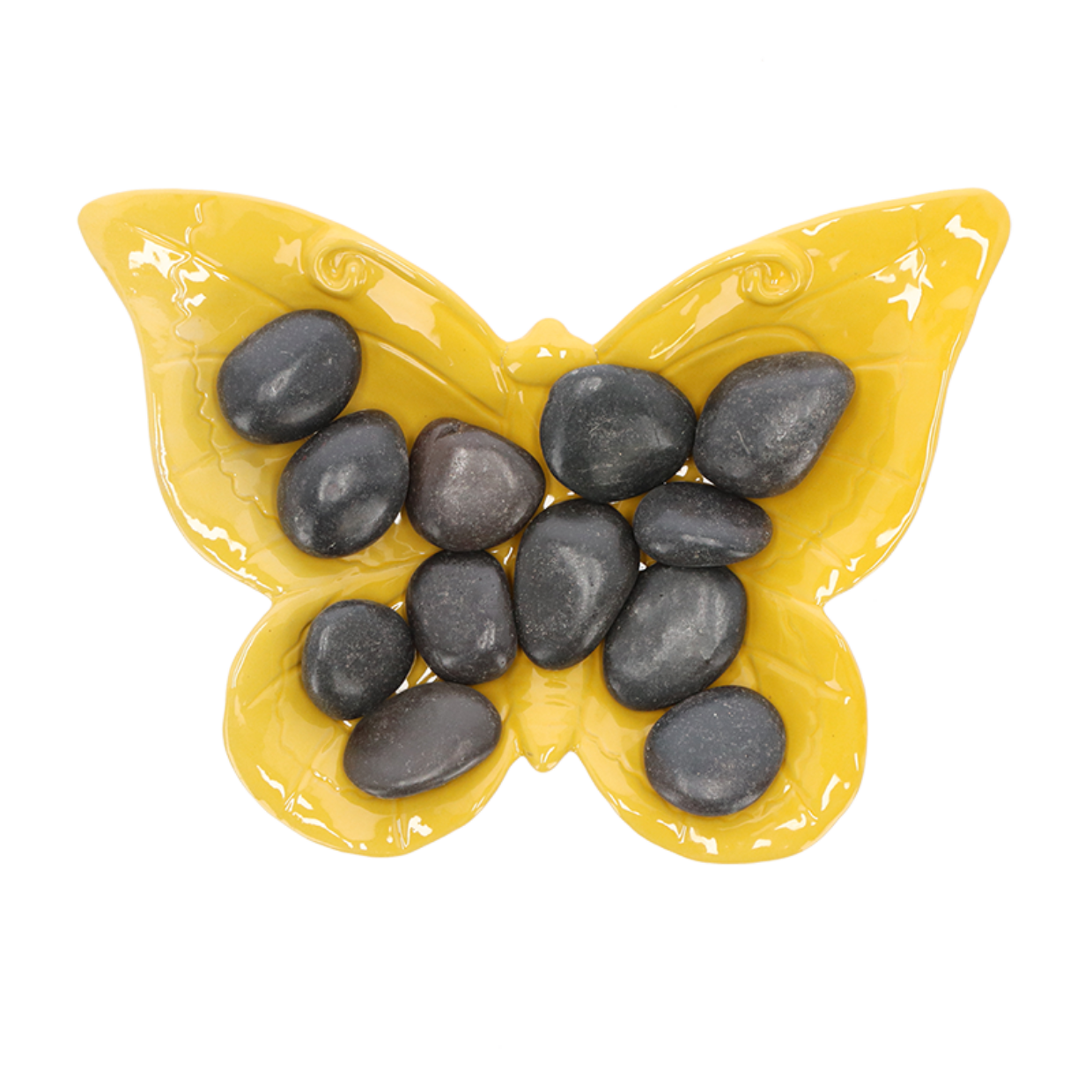 Tränkeschale für Bienen und Schmetterlinge in Form eines Schmetterlings. Wildbienen brauchen Wasser zum Auflösen von kristallisiertem Honig, zum Verdünnen des Honigs bei der Produktion von Larvenfutter, zum Abkühlen bei heißem Wetter und für ein kühles Getränk an einem heißen Tag. Dieses Set besteht aus einer Trinkschale und Steinen, damit die Bienen nicht ertrinken (Bienen können nicht schwimmen) und somit für Schmetterlinge leicht zugänglich sind.