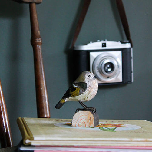 Dies ist eine naturgetreue Darstellung eines Zwergs unter den Vögeln: der Goudhaantje. Der kleine runde Vogel hat ein liebenswertes Aussehen, ist aber schwer zu erkennen, da er sich in den Baumwipfeln versteckt. Mit dem traditionell geschnitzten und bemalten DecoBird Goudhaan haben Sie ein Exemplar, an dem Sie sich jeden Tag erfreuen können.