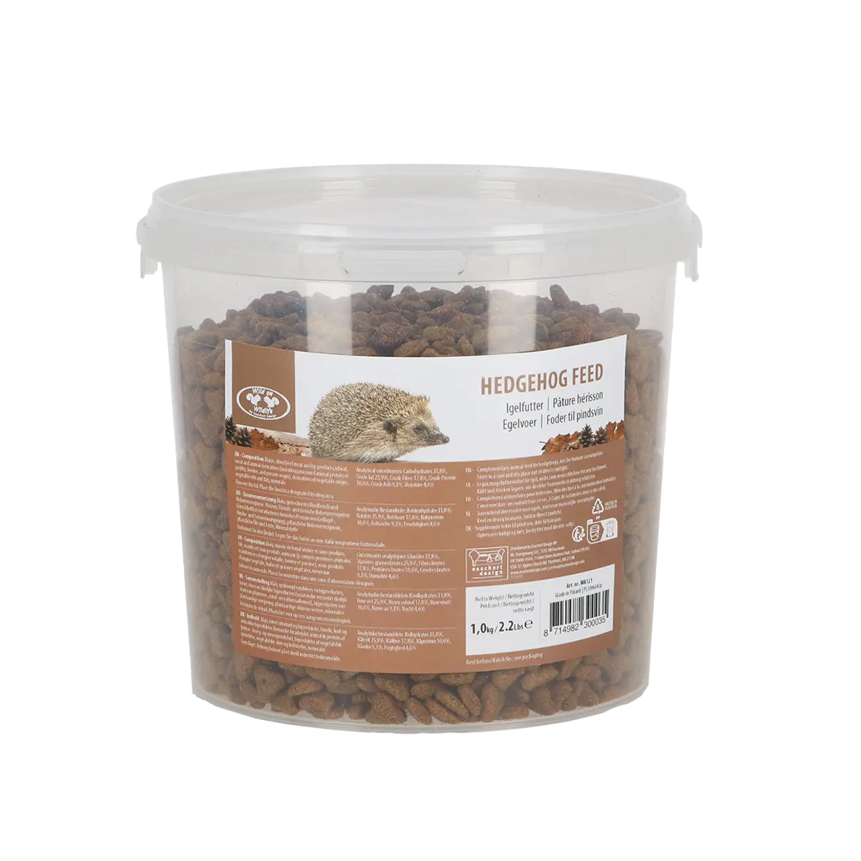Dit voer is ontwikkeld voor egels in de tuin en is direct te gebruiken. Dankzij de handige emmer is het voer eenvoudig op te bergen en blijft het beter beschermd tegen vocht, ongedierte en knaagdieren. Een praktische keuze voor wie egels op een nette en verzorgde manier wil bijvoeren.