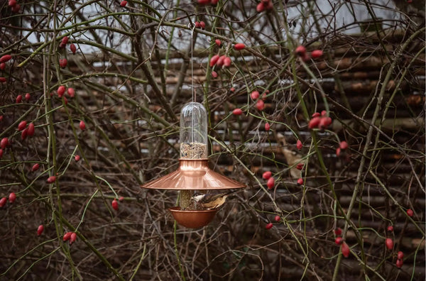 Eva Solo De Luxe vogelvoeder – koper combineert tijdloos Deens design met doordachte functionaliteit. De grote koperen kap beschermt het voer bij regen en natte sneeuw en helpt grotere vogels te weren, zodat kleine tuinvogels ongestoord kunnen eten. De transparante glazen bol laat direct zien wanneer je moet bijvullen (0,75 L).