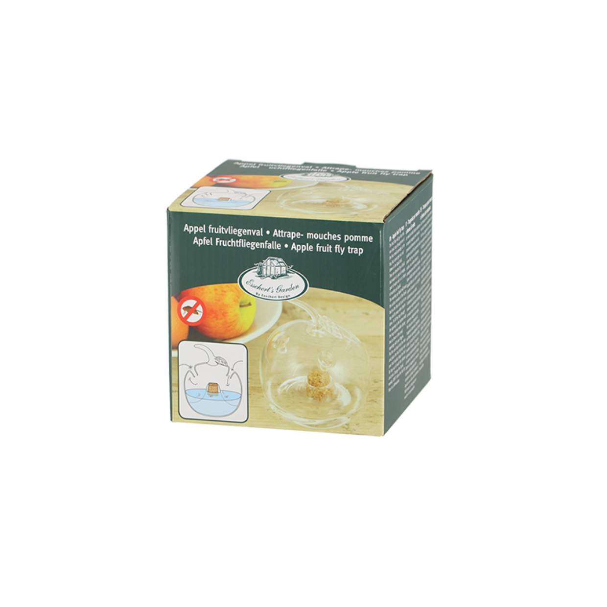 Jeder weiß, dass Fruchtfliegen lästig sein können. Besonders im Sommer werden diese Fluginsekten von Obst in Küche oder Keller angelockt. Diese Fruchtfliegenfalle aus Glas bietet eine ungiftige Lösung, um diese zu bekämpfen. Stellen Sie den durchsichtigen Apfel in die Nähe der Obstschale und geben Sie eine Mischung aus verschiedenen Flüssigkeiten (Wasser, Essig und ein paar Tropfen Spülmittel) in die Falle. Die Fliegen versuchen, durch eines der vier kleinen Löcher oben an die Mischung zu gelangen. Sobald sie sich im Glas befinden, können sie nicht mehr heraus.