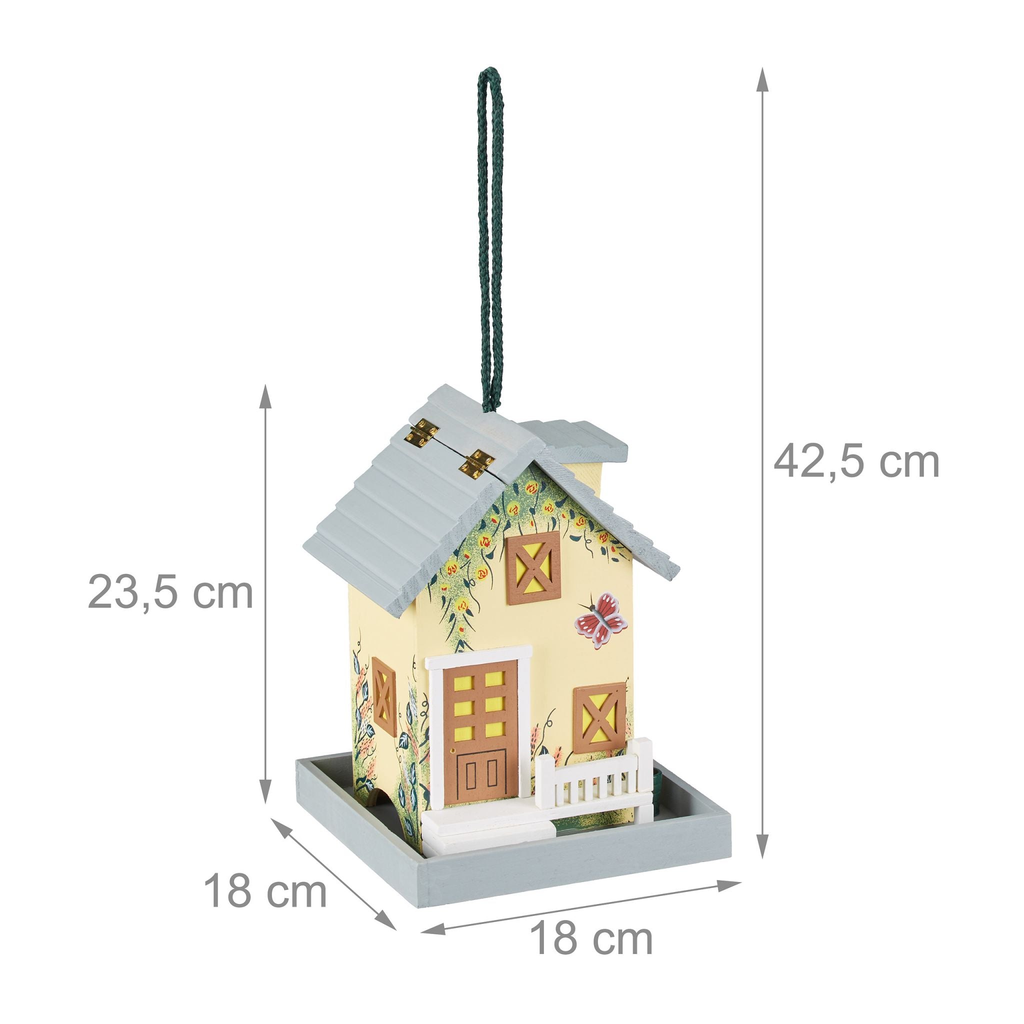 Laden Sie mit dieser farbenfrohen Futterstation Gartenvögel zum Schlemmen in Ihren Garten ein und verwöhnen Sie Ihre gefiederten Freunde mit abwechslungsreichen Leckereien. Sie können das Vogelhäuschen zum Beispiel an einen Ast hängen, wo es sofort auffällt und eine schöne Ergänzung darstellt. Das Vogelhäuschen im Stil eines romantischen Gartenhauses verfügt über wunderschöne Details und Verzierungen. Das Befüllen ist ganz einfach: Deckel öffnen und Futter hineinstreuen. Und dann kann das Anschauen beginnen.
