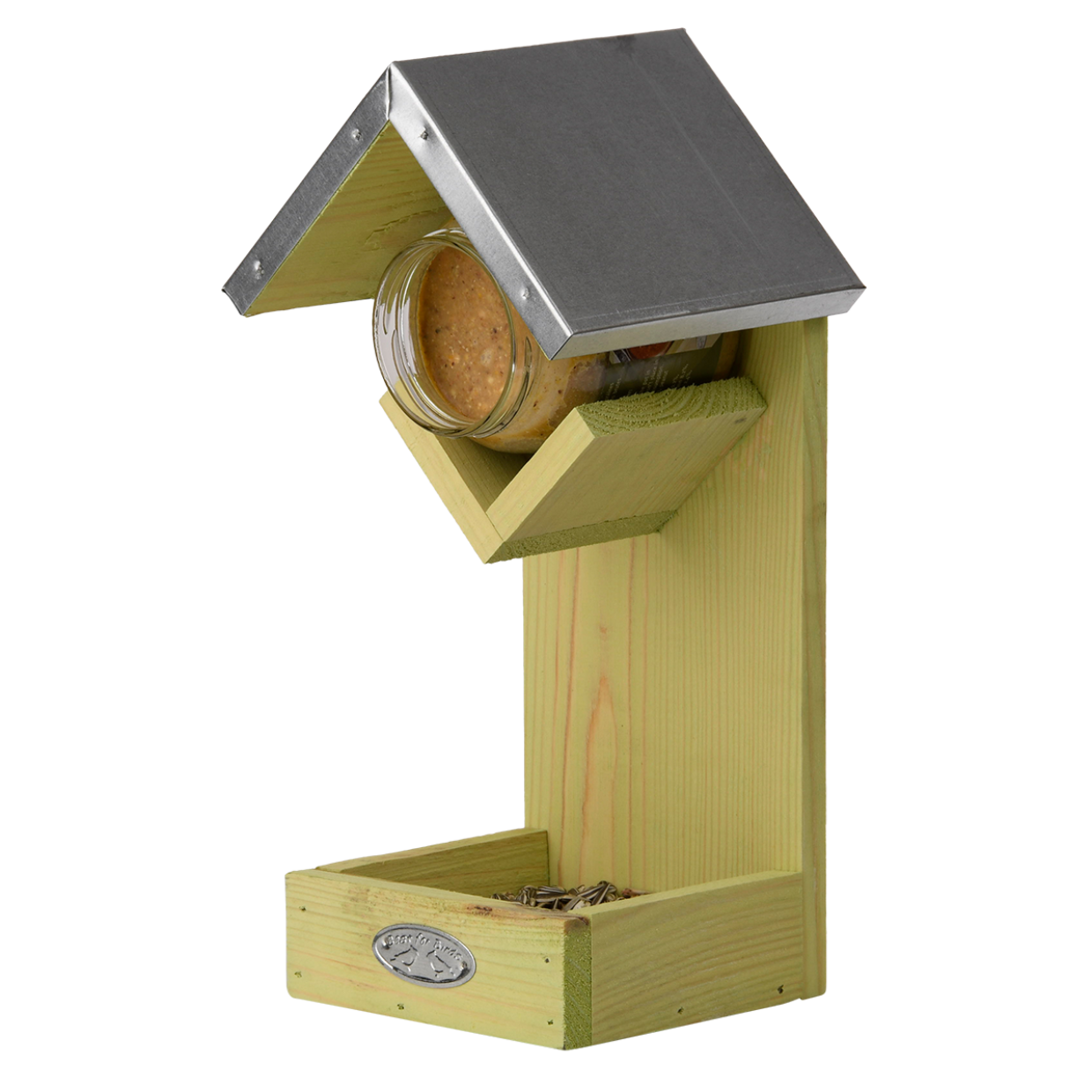 Ein Futterhaus sollte in keinem Garten fehlen. Diese Basisversion mit reinen Materialien bietet Vögeln zwei Fütterungsmöglichkeiten. In den oberen Teil mit Zinkdach kann ein Erdnussbutterglas gestellt werden, und der untere Behälter kann mit verschiedenen Arten von Lebensmitteln gefüllt werden.
