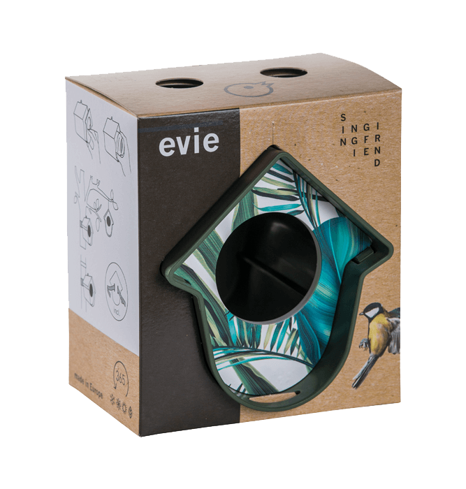 „Hallo, ich bin Evie!“ Ich möchte Ihnen etwas über mich erzählen: Ich bin ein Erdnussbutterglashalter, aber nur ein bisschen anders. Die Vögel lieben mich, wenn ein Leckerbissen in mir steckt. Sowohl große als auch kleine Töpfe können in mir aufbewahrt werden, indem Sie einfach die Holzfront entfernen, den Topf hineinstellen und die Front wieder andrücken. Du hilfst den Vögeln am meisten, wenn du mir spezielle Vogel-Erdnussbutter besorgst. Normale Erdnussbutter ist viel zu salzig. Du kannst mir aber auch anderes Vogelfutter geben. Denken Sie an eine Fettkugel, Erdnüsse oder Sonnenblumenkerne. Sogar einen halben Apfel kannst du schnell und einfach in mich stecken.Was auch sehr praktisch an mir ist, dass du mich an vielen Stellen in deinem Garten oder Balkon aufhängen kannst. Mittels des mitgelieferten Klettverschlusses oder mit einer Schraube können Sie mich ganz einfach z. B. an einem Regenrohr, einem horizontalen oder vertikalen Zaun oder einer Wand befestigen. Du kannst mir aber auch ein anderes schönes Plätzchen aussuchen, denn ich passe fast überall hin. Ehrlich gesagt finde ich, dass ich ziemlich gut aussehe. Ich habe schöne Linien und du kannst auch wählen, in welcher Farbe du mich haben möchtest. Ich komme in nicht weniger als 6 verschiedenen Farben. Auf diese Weise können Sie die Farbe auswählen, die am besten zu Ihnen passt. Evie, das ist mein Name. Nicht vergessen eh!