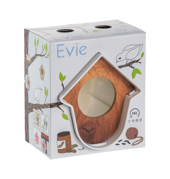 „Hallo, ich bin Evie!“ Ich möchte Ihnen etwas über mich erzählen: Ich bin ein Erdnussbutterglashalter, aber nur ein bisschen anders. Die Vögel lieben mich, wenn ein Leckerbissen in mir steckt. Sowohl große als auch kleine Töpfe können in mir aufbewahrt werden, indem Sie einfach die Holzfront entfernen, den Topf hineinstellen und die Front wieder andrücken. Du hilfst den Vögeln am meisten, wenn du mir spezielle Vogel-Erdnussbutter besorgst. Normale Erdnussbutter ist viel zu salzig. Du kannst mir aber auch anderes Vogelfutter geben. Denken Sie an eine Fettkugel, Erdnüsse oder Sonnenblumenkerne. Sogar einen halben Apfel kannst du schnell und einfach in mich stecken.Was auch sehr praktisch an mir ist, dass du mich an vielen Stellen in deinem Garten oder Balkon aufhängen kannst. Mittels des mitgelieferten Klettverschlusses oder mit einer Schraube können Sie mich ganz einfach z. B. an einem Regenrohr, einem horizontalen oder vertikalen Zaun oder einer Wand befestigen. Du kannst mir aber auch ein anderes schönes Plätzchen aussuchen, denn ich passe fast überall hin. Ehrlich gesagt finde ich, dass ich ziemlich gut aussehe. Ich habe schöne Linien und du kannst auch wählen, in welcher Farbe du mich haben möchtest. Ich komme in nicht weniger als 6 verschiedenen Farben. Auf diese Weise können Sie die Farbe auswählen, die am besten zu Ihnen passt. Evie, das ist mein Name. Nicht vergessen eh!