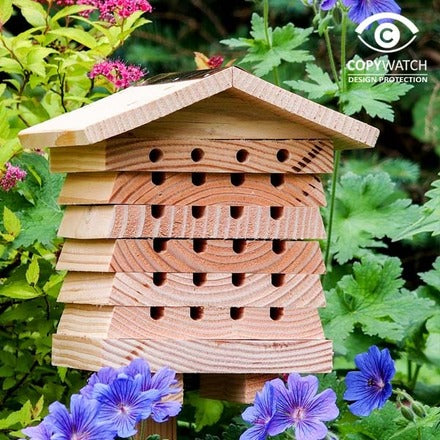 Immer ein Freund des Gärtners, das Anlocken von Einzelbienen in den Garten fördert die Bestäubung von Blumen, Gemüse und Früchten. Die Lochgrößen dieses Bienenstocks sind genau festgelegt, um nicht schwärmende Bienen wie die Rote Mauerbiene, die Blattschneiderbiene und andere anzulocken einsame Bienen. Diese freundlichen Bienen sind in der Nähe von Kindern und Haustieren sicher. Die Bienen werden natürlich von Löchern im Holz angezogen. Stellen Sie es an einen sonnigen Standort mit Blick nach Südosten, um etwas Morgensonne einzufangen. Montagehöhe zwischen Bodenniveau und 1,5 m. Keine chemischen Behandlungen erforderlich, da dieser Bienenstock aus nachhaltigem, FSC-zertifiziertem Holz hergestellt wird. Stapelbehälter können nach Beendigung der Bienenaktivität inspiziert werden