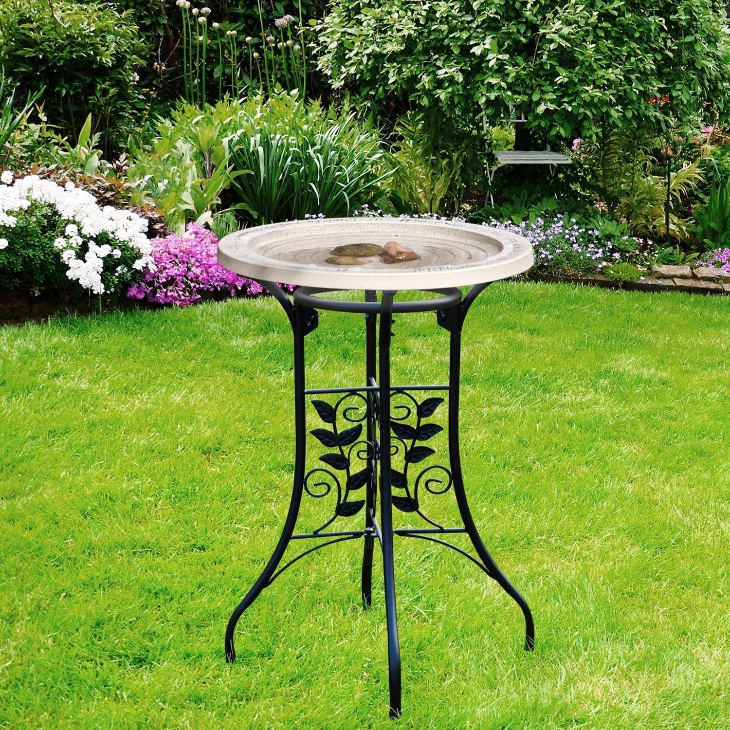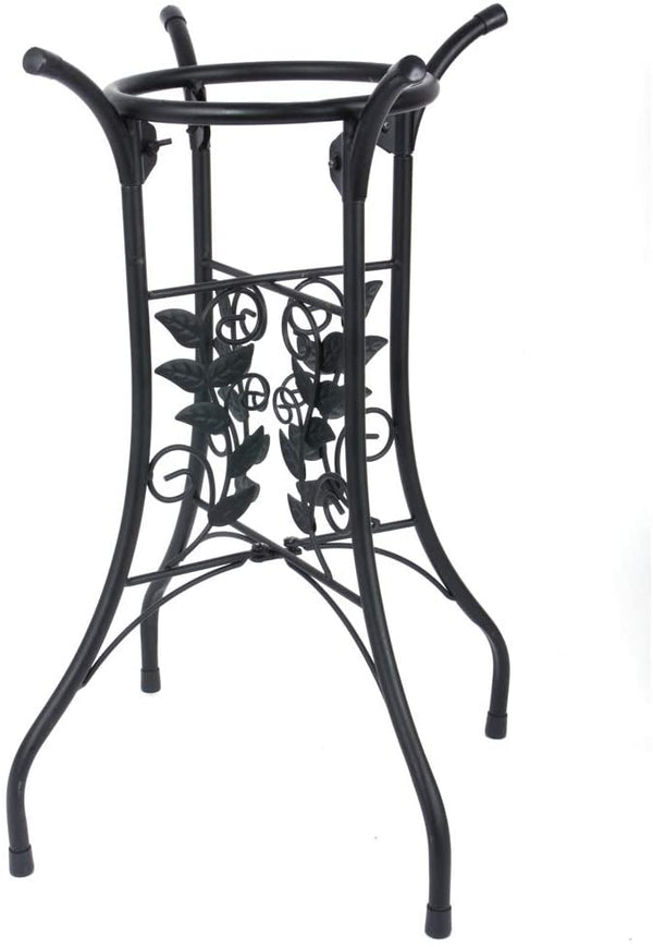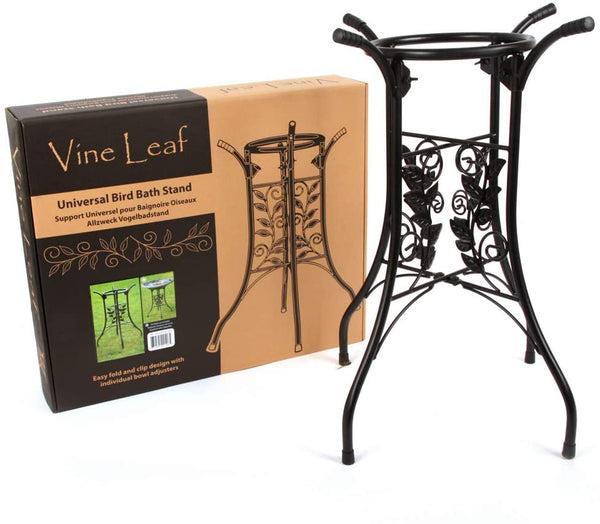 Ein klassisches Weinblatt-Design auf den ausklappbaren Beinen des universellen Vogeltränken-Ständers ergänzt die meisten Vogeltränken-Designs. Der Ständer besteht aus einem Stahlrohr mit schwarzer Pulverbeschichtung. Wir haben die Schüsselstützen mit Gummiabdeckungen versehen, um ein Verrutschen Ihres Vogelbads zu verhindern.