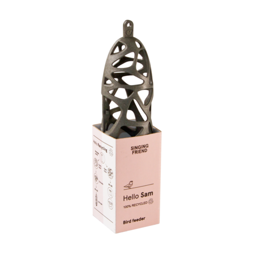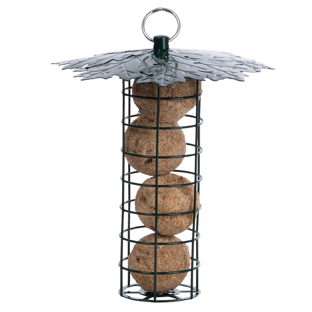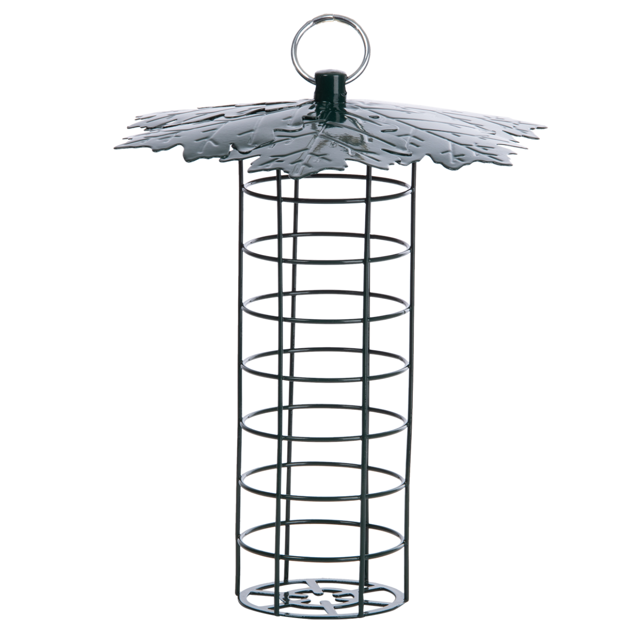 Dieser Meisenknödelspender mit Baldachin lässt sich einfach nachfüllen. Der Deckel kann durch Abschrauben des Rings entfernt werden. offene Struktur, leicht zugänglich leicht nachfüllbar Deckel in Blattform
