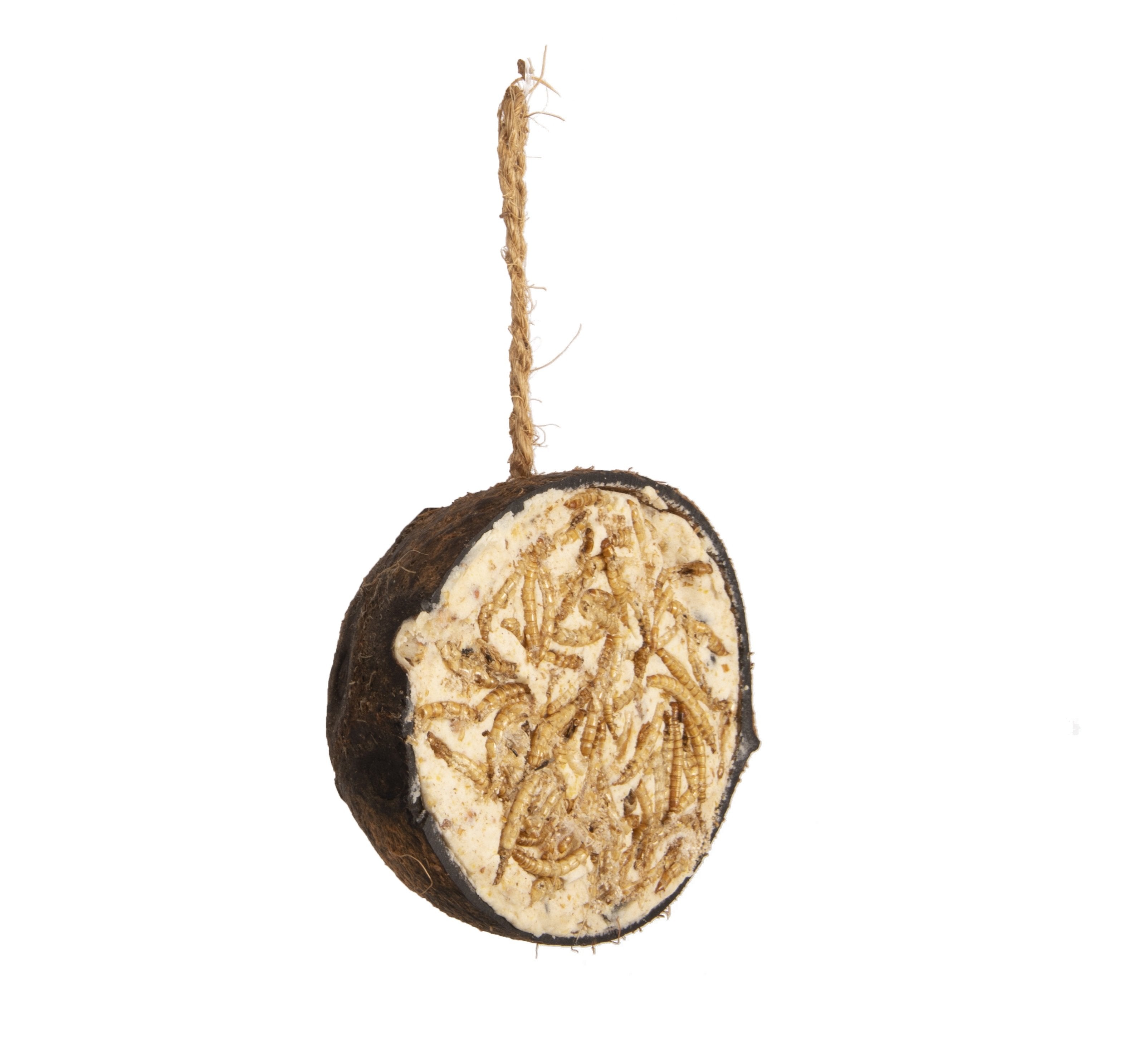 Eine echte Delikatesse in einer halben Kokosnuss. Diese Kokoshälfte ist mit einem kalorienreichen Fett mit Mehlwürmern gefüllt. Diese Delikatesse ist nicht nur kalorienreich, sondern auch proteinreich und eine ideale Energiequelle für Gartenvögel. Die tierischen Proteine der Mehlwürmer sind wichtige Bausteine für Gartenvögel.