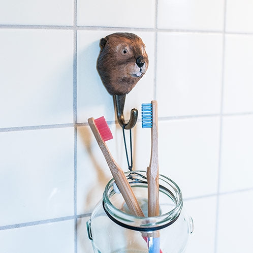 Biber-Kleiderhaken aus Holz Dieser dekorative Kleiderhaken mit geschnitztem Biberkopf bringt einen Hauch von Natur in Ihr Zuhause. Der Haken selbst ist aus Metall und der Tierkopf ist aus Lindenholz handgeschnitzt und mit umweltfreundlichen Farben handbemalt. Der Haken lässt sich einfach mit einer Schraube an der Wand aufhängen und funktioniert perfekt im Flur, Schlafzimmer, Küche oder sogar im Badezimmer.Unsere dekorative Hakenkollektion umfasst eine Vielzahl von Tieren aus aller Welt und ist ein perfektes Geschenk für Naturliebhaber und Design-Gurus gleichermaßen. Über den amerikanischen Biber Der nordamerikanische Biber ist ein Wassersäugetier und das zweitgrößte Nagetier der Welt. Er hat ein dickes, braunes Fell und einen flachen, breiten Schwanz und kann bis zu 1 Meter lang werden. Biber leben in der Nähe von Seen und Wasserläufen, wo sie Dämme und Nester aus Holzzweigen bauen. Sie sind ausgezeichnete Schwimmer und können bis zu 15 Minuten unter Wasser bleiben. Obwohl sie starke Zähne haben, um Bäume zu fällen, ist der Biber Vegetarier und frisst bevorzugt Seerosen.