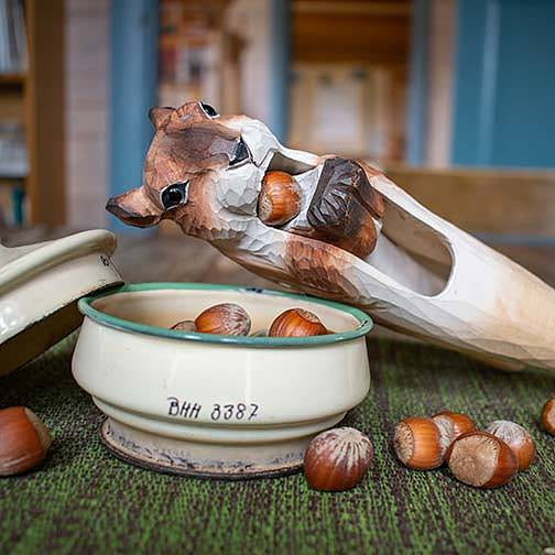 Unser Nussknacker ist ein besonderer und massiver Nussknacker aus massivem Lindenholz. Es zeigt ein Eichhörnchen, das eine Nuss in seinen Händen hält, und Sie drücken die Griffe, um die Nuss zu knacken. Es können Nüsse bis zu einer Größe von 3 cm geknackt werden. Der Nussknacker ist aus geschnitztem Holz handgefertigt und mit umweltfreundlichen Farben bemalt. Über Eichhörnchen: Eichhörnchen lagern Nüsse und Eicheln für den Winter, und sie können Nahrung bis zu einem Meter unter dem Schnee finden. Eichhörnchen ernähren sich protein-, kohlenhydrat- und fettreich, da sie Zellulose nicht verdauen können. Sie ernähren sich hauptsächlich von Nüssen, Eicheln und Samen, fressen aber auch Zapfen, Früchte und Grünpflanzen. Im zeitigen Frühjahr beginnen die vergrabenen Nüsse zu sprießen und stattdessen werden die Knospen der Bäume zu einer wichtigen Nahrung.