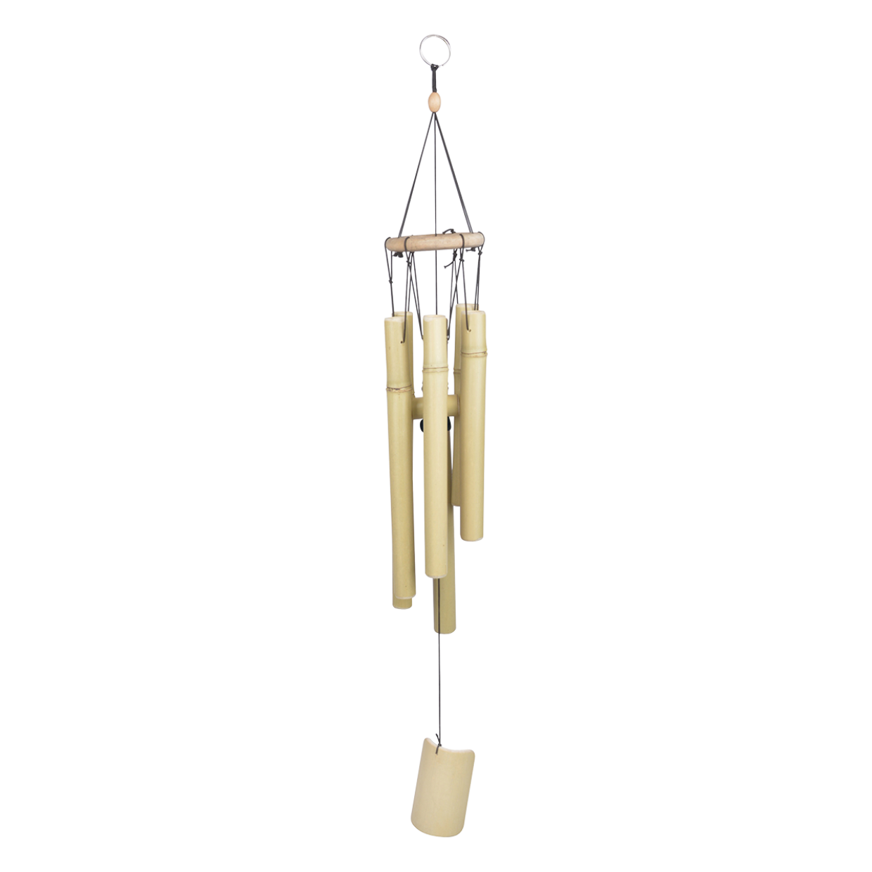 Der Wind versetzt die Bambusscheibe in Bewegung und erzeugt einen harmonischen und beruhigenden Klang. Der Kordelstopper ermöglicht zudem ein „Ausschalten“. Bambus ist ein Naturmaterial, daher hat jedes Windspiel seinen eigenen Charakter. Durch die unterschiedliche Länge der Bambusrohre entstehen unterschiedliche Tonhöhen.